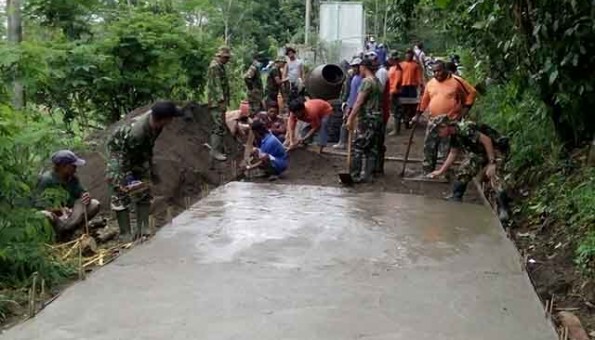Klaten — Proses betonisasi di jalur evakuasi Desa Panggang, Kecamatan Kemalang, terus dikebut prajurit TNI yang tergabung dalam satuan tugas (satgas) TMMD Reguler ke-96 Kodim 0723/Klaten. Selain itu, sasaran fisik berupa jambanisasi dan rumah tidak layak huni (RTLH) juga mulai digarap.