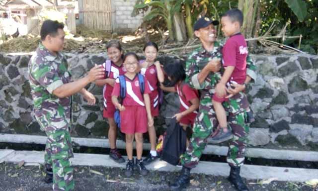 KLATEN,  Disela-sela kesibukannya melaksanakan TMMD, sejumlah prajurit yang tergabung dlm Satgas TMMD REG 96 kodiiim 0723/Klaten,memanfaatkan untuk bersosialisasi dengan warga maassyarakat. Tidak ketinggalan anak-anak yang di Desa Panggang, desa sasaran TMMD Kodim Klaten.
