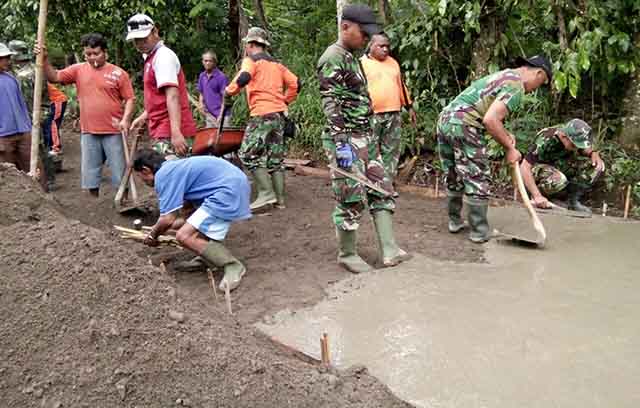KLATEN – Berkat kerjasama yang efektif antara parajurit yang tergabung dalam Satgas TMMD Reguler ke-96 Kodim 0723/Klaten bersama warga masyarakat Desa Panggang, Kecamatan Kemalang, menginjak hari ke-7, pengerjaan betonisasi jalan sudah mencapai 30 persen dari target yang ada. ‘’Alhamdulillah berjalan sesuai rencana. Ke depan akan kita tingkatkan terus, sehingga yang sudah kitatentukan bisa sesuai,’’ tandas Danramil Kemalang, Kapten Inf. Jatmiko, yang ditemui di lokasi TMMD