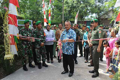 KLATEN – Simbol peresmian penggunaan jalan baru hasil gotong royong warga dan TNI dalam program TMMD regulerke- 96 Kodim 0723/Klaten, adalah dengan diguntingnya pita oleh Sekda Kabupaten Klaten Drs H Joko Sawaldi MM. Dalam kesempatan ini Sekda Joko berpesan kepada warga Desa Panggang dan sekitarnya agar merawat jalan baru ini. ‘’Kita ketahui bersama bahwa fungsi dari jalan baru itu adalah untuk membuka jalur evakuasi yang baru khususnya untuk warga Dukuh Suren, Desa Panggang Kecamaan Kemalang ,’’ ungkapnya. Sebelum ada jalan baru, lanjut Sekda Joko, orang harus melingkar ke bawah dulu baru sampai ke jalur evakuasi utama (Jalan besar Panggang – Bale Rante- Red). Jalan yang beton TNI bersama warga masyarakat itu dulunya adalah jalan setapak. Di TMMD dilebarkan menjadi 3 m dan dicor sehingga kendaraan roda empat kini bisa masuk ke Dukuh Suren yang paling dalam. (pendim 0723/Klaten)