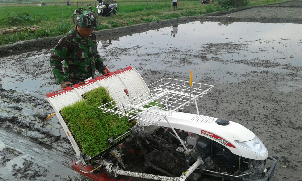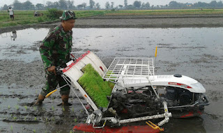 Pada hari Senin Tanggal 29 Agustus 2016 Pukul 08:00 WIB bertempat Di lahan sawah milik Bapak Suratno kelompok tani Dadi Makmur Dukuh Kutu Desa Sumyang Kecamatan Jogonalan Pendamping Babinsa Sumyang Serda Giyono dan di bantu Anggota Koramil 02/Jogonalan Serda Widodo Purnomo dengan Petugas PPL kec.Jogonalan Bapak Tri Santoso melaksanakan tanam padi dengan menggunakan mesin Transplanter yang merupakan inventaris Kodim 0723/Klaten untuk membantu para petani yang ada di Klaten dalam menanam padi.pada kesempatan tersebut ditanam padi jenis IR 64.dengan Luas Lahan sawah 5000 M2.