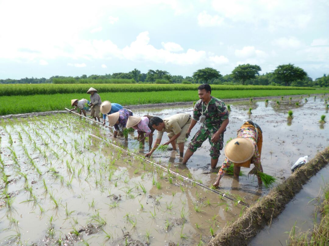 Pelaksanaan gerakan luas tambah taman masa tanam di lahan pesawahan Desa Jaten, Kecamatan Juwiring dibimbing oleh Danramil dan Babinsa serta para PPl Pertanian.