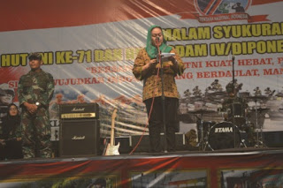 Sementara Bupati Klaten Hj.Sri Hartini SE dalam sambutannya mengatakan atas nama Pemerintah dan masyarakat Kabupaten Klaten mengucapkan selamat atas HUT TNI dan Kodam IV/Diponegoro semoga dengan bertambahnya usia ini Tuhan YME memberikan kekuatan dan bimbingan kepada seluruh keluarga besar TNI dalam tugas pengabdian kepada bangsa dan negara.tak lupa saya juga mengucapkan terima kasih atas perjuangan dan darma bakti selama ini.