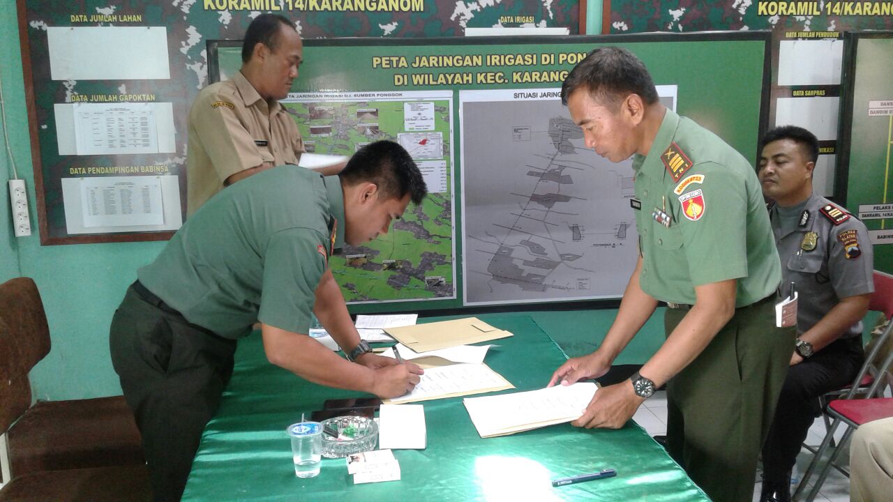 Bertempat di Aula Koramil 14/Karanganom Kodim 0723/Klaten telah diadakan penandatanganan surat kesepakatan bersama pembagian air daerah irigasi saluran kanan sumber Ponggok. Selasa (1/11). Menindaklanjuti surat kesepakatan bersama pembagian air daerah irigasi sumber Ponggok pada tangal 6 oktober 2016. Dimana dalam pembagian tersebut untuk wilayah kiri yang meliputi kecamatan Polanharjo mendapat 1/3 bagian. Yang digunakan untuk mengairi sawah seluas 272 Ha, dan untuk wilayah kanan yang meliputi kecamatan Karanganom mendapatkan 2/3 bagian yang dimanfaatkan untuk mengairi sawah seluas 637 Ha.