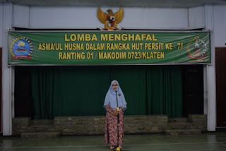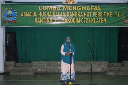 Dengan suara merdu dan membikin merinding bagi yang mendengarkan pada acara lomba menghafal Asmaul Husna di Aula Makodim 0723/Klaten. Pada kegiatan tersebut diikuti sekitar 50 orang anggota Persit KCK Ranting 1 Cab XLIV Kodim 0723/Klaten. Dengan sangat antusias dan semangat para perserta mengikuti lomba manghafal Asmaul Husna. Sebagai Juri Serma H. Yuswanto, Peltu Prn H Tariyanto dan Ustad Asyar serta Ibu Ketua Persit KCK Cab XLIV Kodim 0723/Klaten Ny. Intan Bayu Jagat.