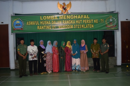 Kegiatan ini bertujuan untuk menambah keimanan dan ketaqwaan Persit terhadap Allah SWT, dan agar bisa mengamalkan asmaul husna pada kehidupan sehari hari, kegiatan ini tidak hanya dilaksanakan di Ranting 1 namun juga masing masing koramil juga melaksanakannya dan bagi juara 1 s.d 3 masing masing ranting/Koramil akan dilombakan lagi di Makodim 0723/Klaten pada bulan April mendatang.Pendim 0723/Klaten.