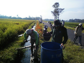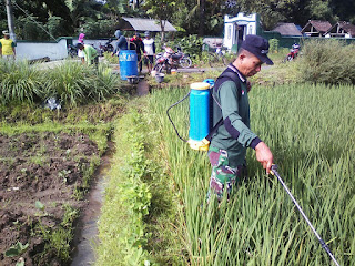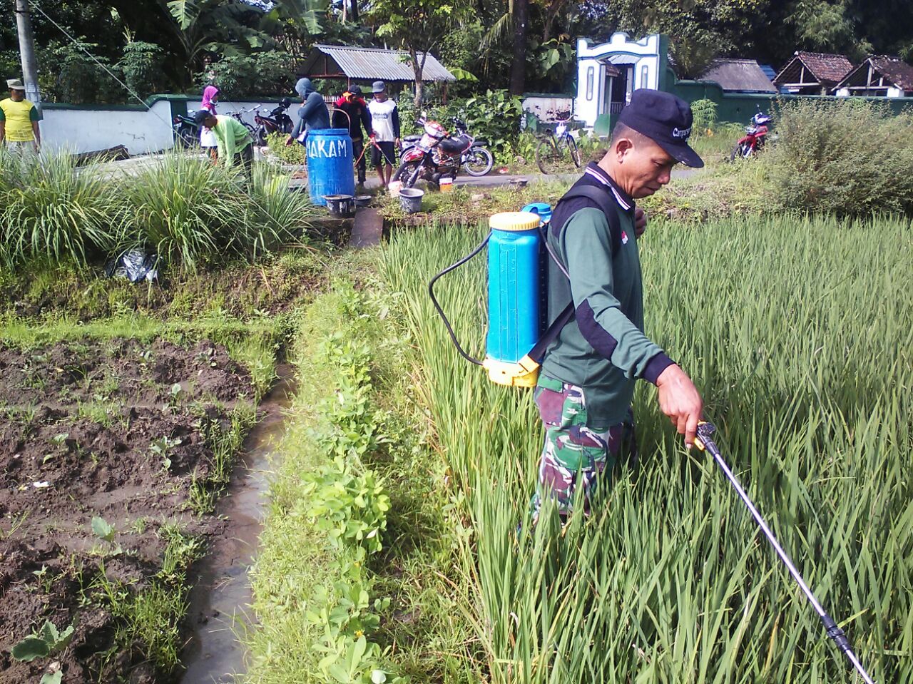 Klaten (11-03-17) Babinsa Ramil 14/Karanganom Pelda Sutikno melaksanakan penyemprotan hama wereng pengerek padi di Dukuh Pandanan, Desa Soropaten, Kecamatan Karanganom bersama masyarakat Pandanan dengan luas persawahan ± 15 Hektar. Pada kegiatan tersebut di hadiri pula perangkat Desa, Ketua Gapoktan, ketua PPL dan Petani yang tergabung dalam Kelompok Tani Ngudi Makmur 2 Desa. Soropaten. Pendim 0723/Klaten