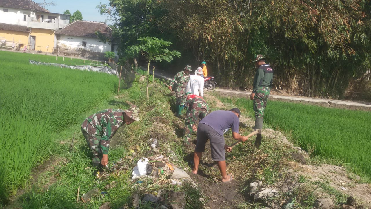 Klaten, Anggota Koramil 23/Ceper, Bersama Kapten Inf Suparno dengan warga desa kuncen yang tergabung dalam kelompok Tani Makmur membersihkan dan memperbaiki saluran irigasi yang ada di Desa tersebut, Desa Kuncen Kecamatan Ceper Kabupaten Klaten.