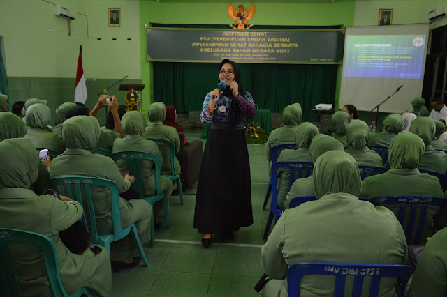 Guna mempererat jalinan silaturahmi dan kebersamaan serta meningkatkan derajat kesehatan istri prajurit, Persit Kartika Chandra Kirana Cabang XLIV Kodim 0723 Klaten terima penyuluhan kesehatan dengan Tema “ Perempuan Sadar Vagina “ dari dr. Inge Satyo Ariyanto Founder PSV dan Bagus Setiawan, M.Si., Apt. Co Founder PSV di Aula Kodim 0723/Klaten.(01/04/19)
