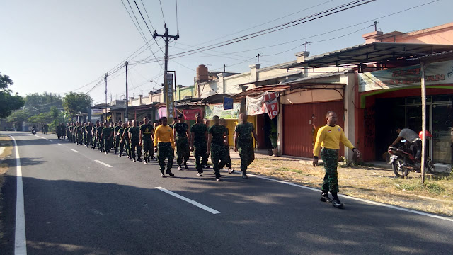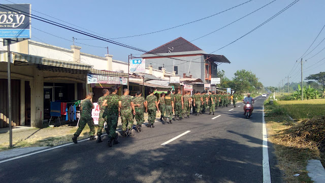 Prajurit Kodim 0723/Klaten melaksanakan Hanmars di seputaran wilayah Desa Karanglo Klaten Selatan Kabupaten Klaten dalam rangka Minggu milter dan untuk menunjang kesiapan fisik menyambut TMMD Reg 105 yang akan di buka bulan Juli 2019, Selasa (25/06/19).