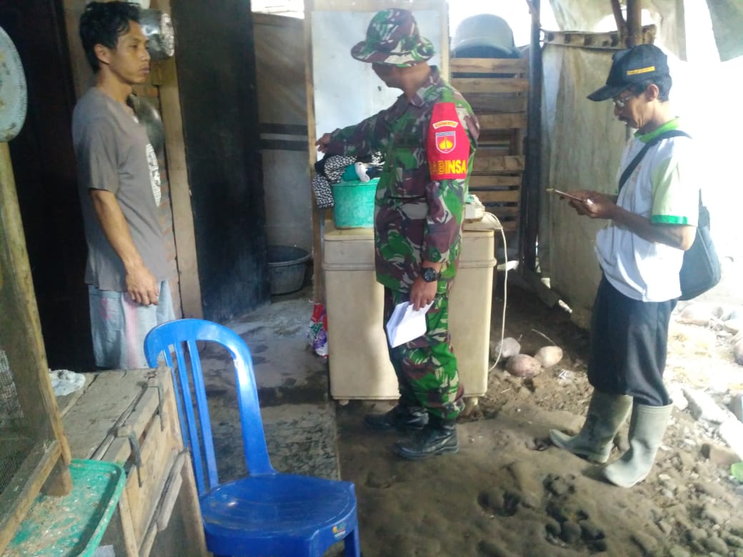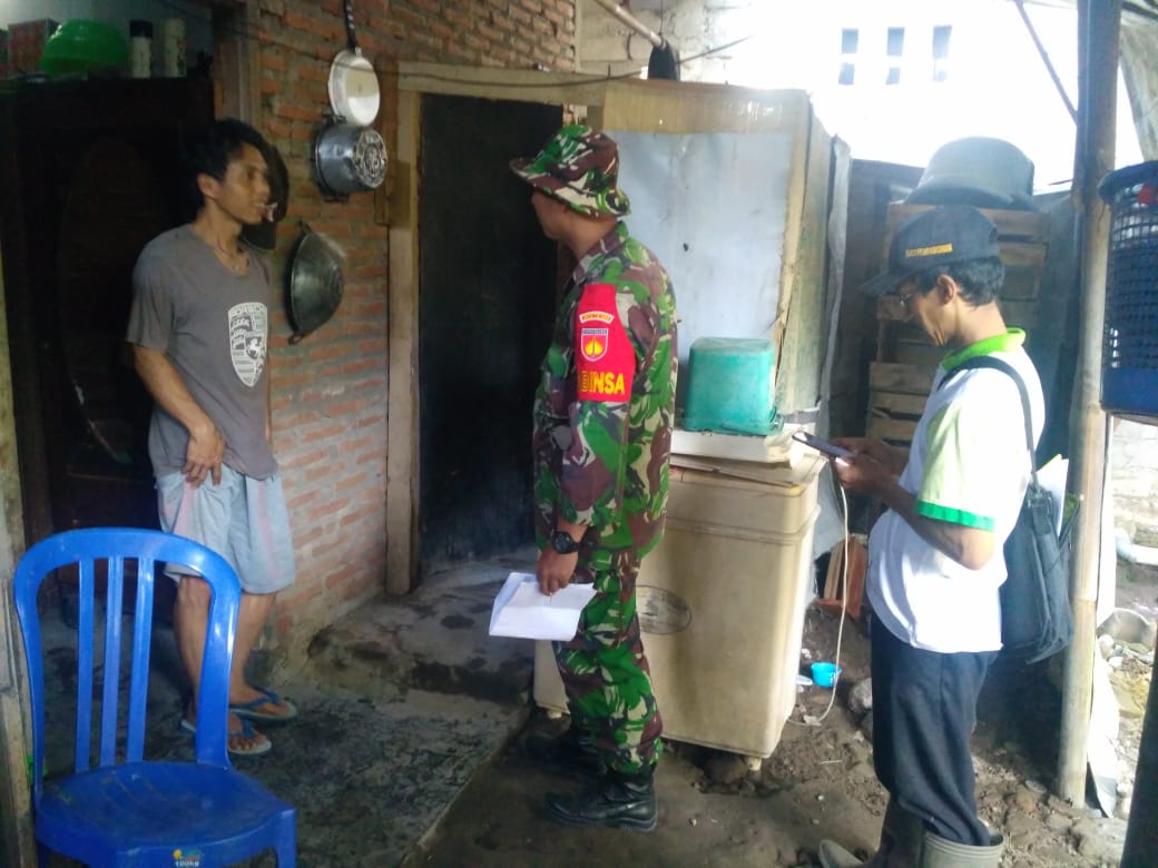 Bintara Pembina Desa (Babinsa) Koramil 01 Kota Klaten Koptu Hartono bersama dengan Yuniar Suswandono Kasi Pemerintahan Desa Jimbung Kecamatan Kalikootes Kabupaten Klaten meninjau rumah warga yang akan mendapat bantuan Jambanisasi pada TMMD Reg 105 Tahun 2019 di Wilayah Kodim 0723/Klaten, Selasa (25/06/19)