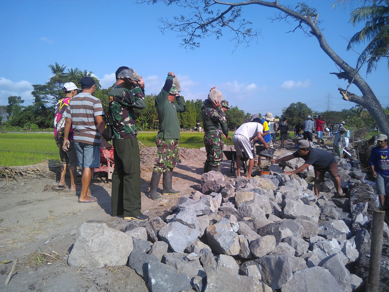 Warga Desa Jimbung Kecamatan Kalikotes Kabupaten Klaten, bersama dengan Prajurit Kodim 0723/Klaten bergotong royong untuk menyiapkan bahan pokok pembuatan talut, dan dilanjutkan untuk pengerjaan pembuatan talut.