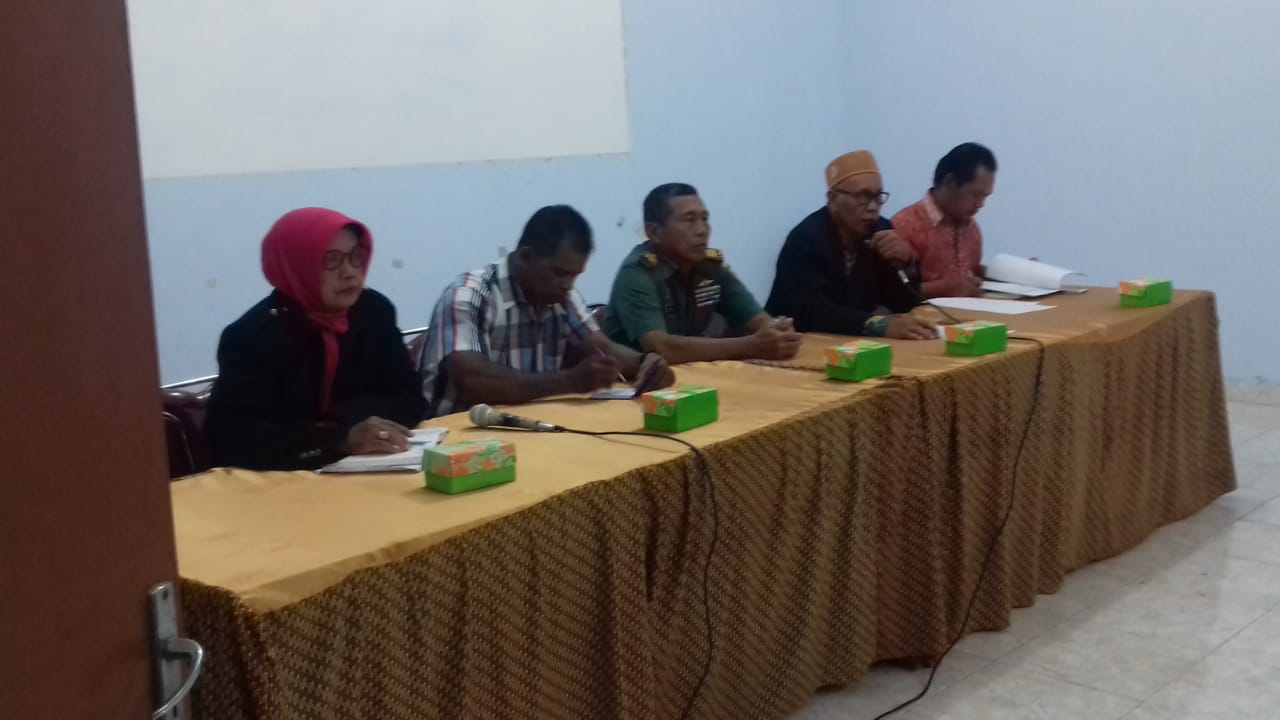 Menjelang akan dibukanya upacara pembukaan TMMD Reguler 105 Tahun 2019 Siti Sumarsih Kades Jimbung bersama Danramil 01 Kota Kapten Czi Rusmani dan Batih Ter kodim 0723 Klaten Pelda Sunaryo dengan seluruh perangkat Desa, BPD, PKK, TPK, BUMDES, Kelompok Wanita Tani, Karang Taruna dan Posyandu Desa Jimbung menggelar rapat koordinasi terkait dengan penyiapan panitia upacara pembukaan TMMD di Aula Balai Desa.