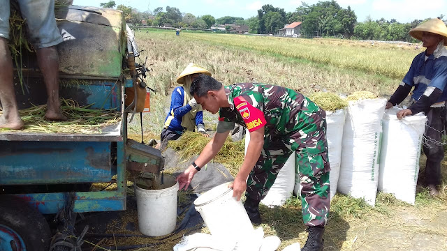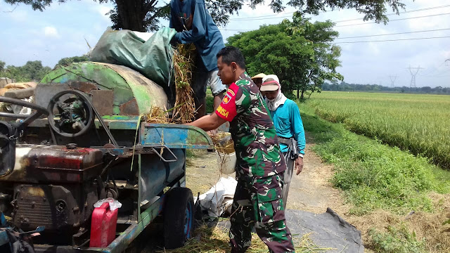 Usai panen padi bersama dengan petani padi desa binaannya, Koptu Suparman Babinsa Kuncen juga turut bantu petani lakukan perontokan padi dengan menggunakan mesin perontok padi di sawah milik pak Purnomo anggota kelompok tani makmur Ds Kuncen dengan luas sawah yang sudah di panen 2.200m2.