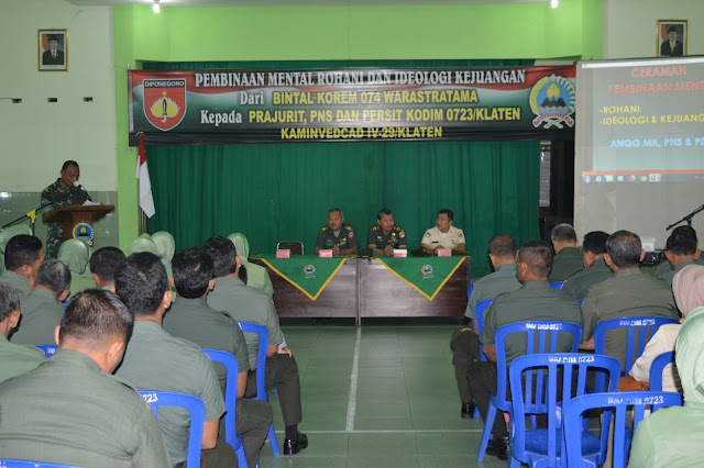 Bertempat di Aula Makodim 0723/Klaten, prajurit dan Persit serta PNS Kodim 0723/Klaten menerima ceramah Pembinaan Mental Rohani dan Ideologi Kejuangan dari Bintal Korem 074/Warastratama, Selasa (9/7/2019).