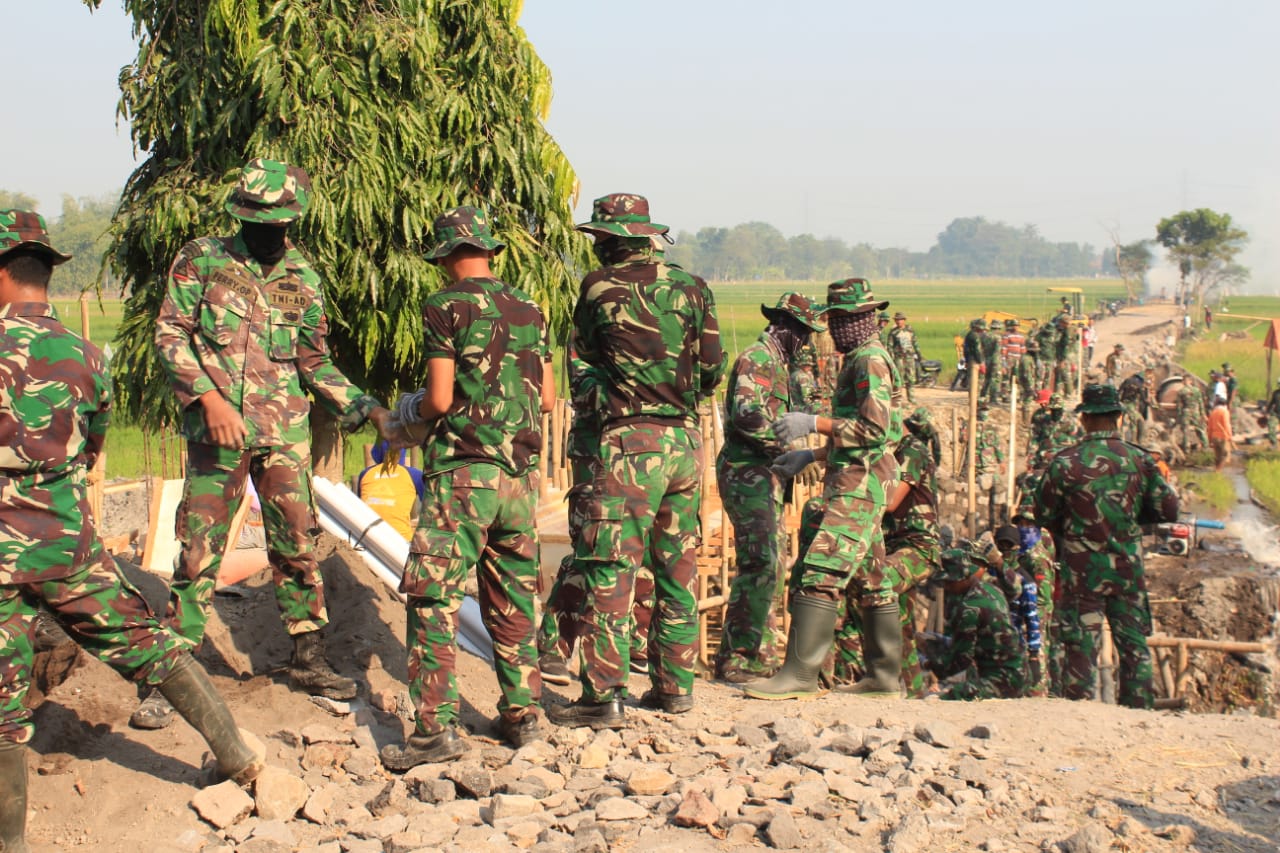 Ratusan personil TNI bersama warga Desa Jimbung bahu-membahu untuk segera menyelesaikan proyek jembatan yang merupakan jalur penghubung Desa Jimbung ke Desa Krakitan.