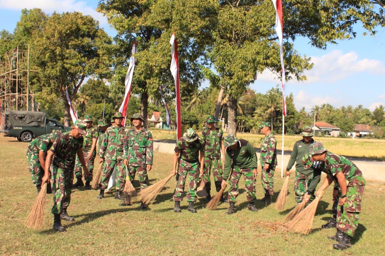 Dari pantauan, tampak sejumlah prajurit anggota Satgas TMMD Kodim Klaten, tengah bersih-bersih lapangan Desa Jimbung, selain itu juga memasang baleho, memasang tenda dan umbul umbul.