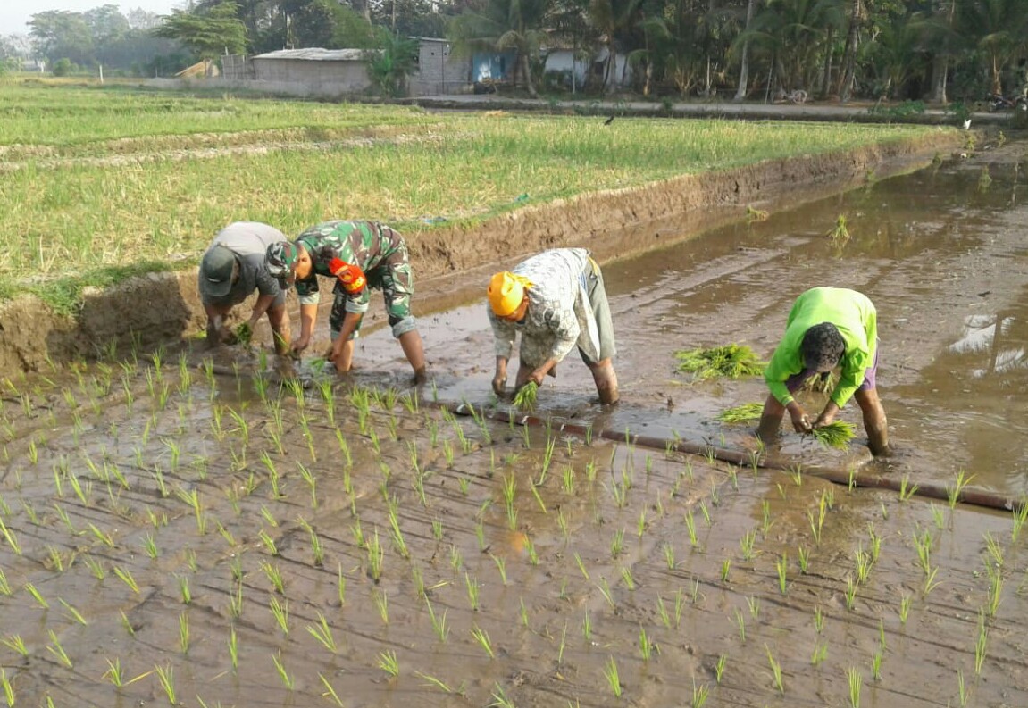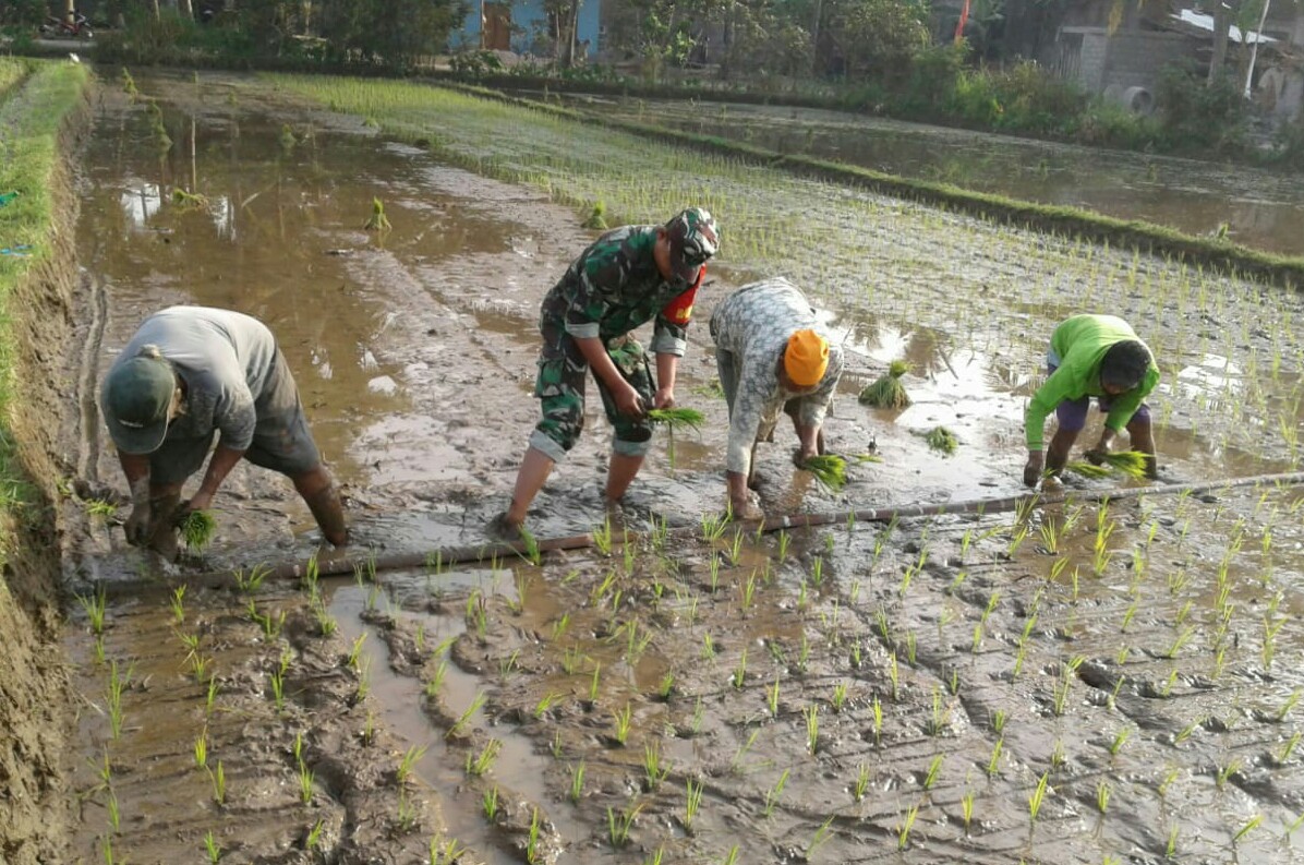 Babinsa Koramil 10/Gantiwarno Kodim 0723/Klaten Serka Warsidi membantu petani binaannya menanam padi guna mensukseskan swasembada pangan nasional, bertempat di Desa Gentan, Kecamatan Gantiwarno, Selasa (15/10/19).