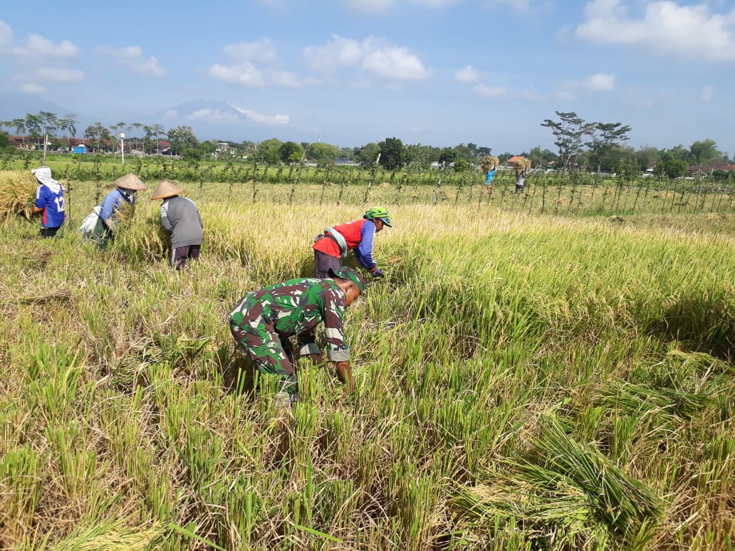 Kegiatan panen padi jenis inpari di areal sawah seluas 2.000 meter milik Bowo salah satu anggota Kelompok Tani (Poktan) Tani Raharjo dilakukan secara manual oleh petani yang didampingi langsung Babinsa setempat.