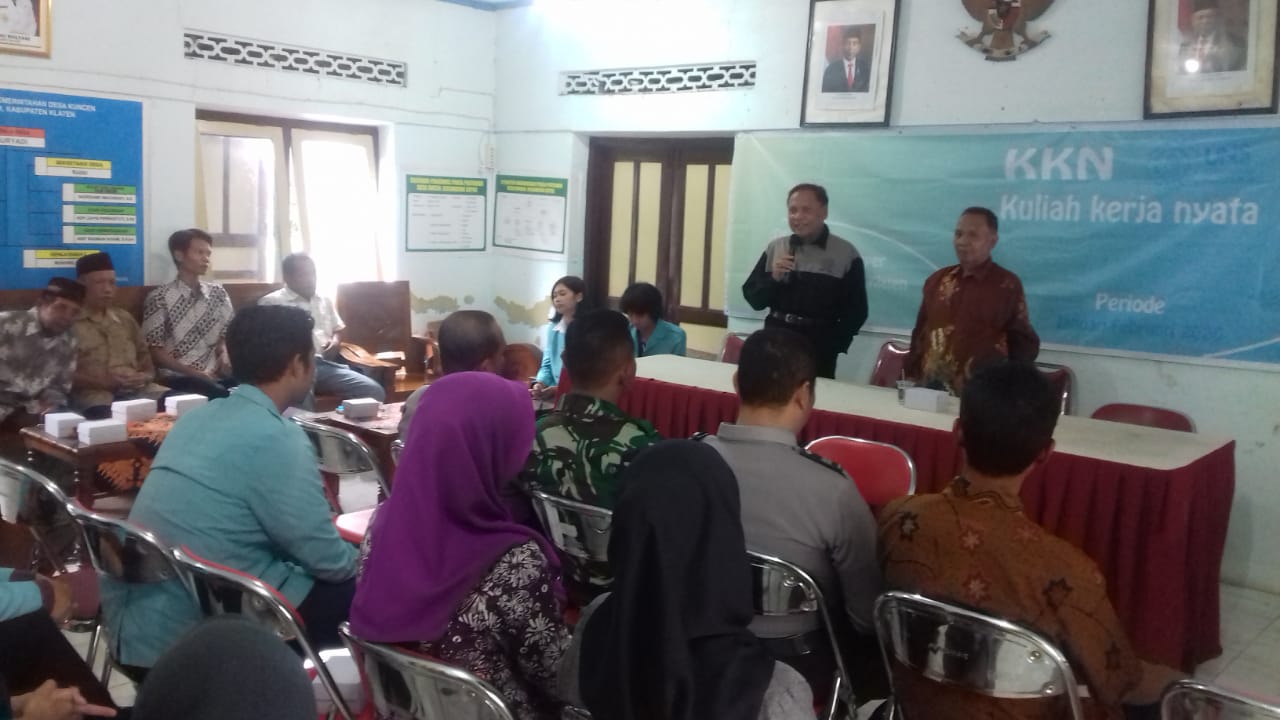 Hadir dalam acara tersebut, Kepala Desa beserta Perangkat Desa Kuncen, Pembina KKN dari UNS Surakarta, Kanit Bimas Polsek Ceper, Babinsa Desa Kuncen, Bhabinkamtibmas Desa Kuncen, Tomas Desa Kuncen dan 8 orang terdiri dari 2 mahasiswa dan 6 mahasiswi yang akan melaksanakan KKN.