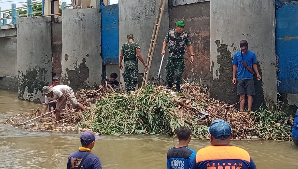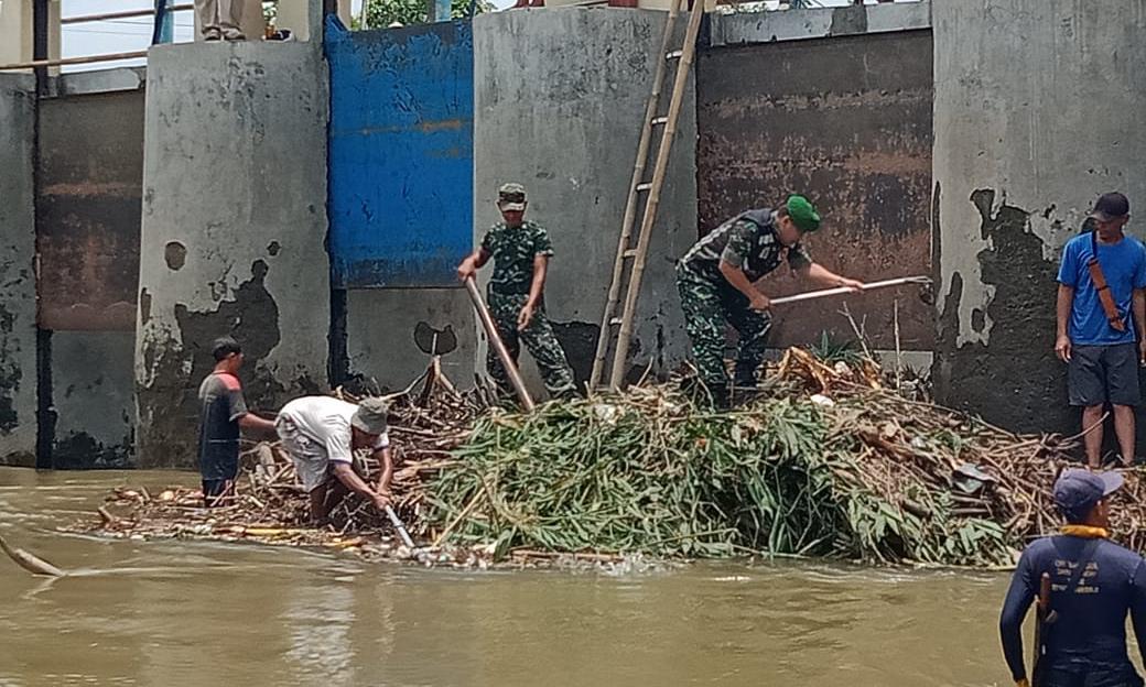 Cegah Banjir dan Perlancar aliran sungai Dengkeng Danramil 20/Cawas Kapten Cpl Tridjoko bersama Team BBWS ( Balai Besar Wilayah Sungai) Bengawan solo dan Babinsa Koramil Cawas bersihkan tumpukan sampah yang menyangkut di sekitar Dam Tukuman Desa Cawas Kecamatan Cawas Kabupaten Klaten, Senin ( 24/2/2020 )
