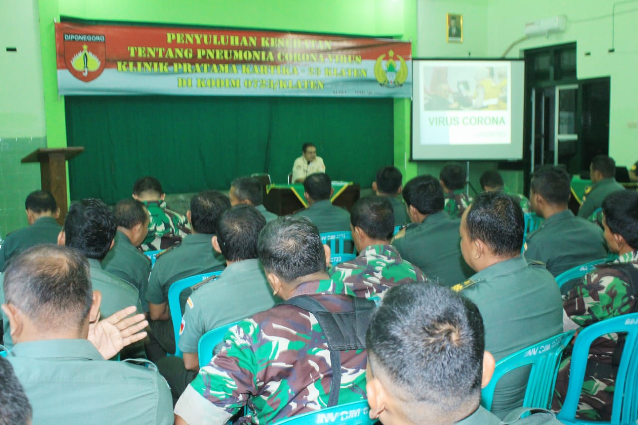 Guna mengantisipasi dan mencegah penyebaran virus corona ini, prajurit dan PNS jajaran Kodim 0723/Klaten  menerima penyuluhan kesehatan tentang penyebaran Pnemunia Virus Corona oleh Tim Kesehatan dari Klinik Pratama Kartika-23 Klaten, Senin (3/2).