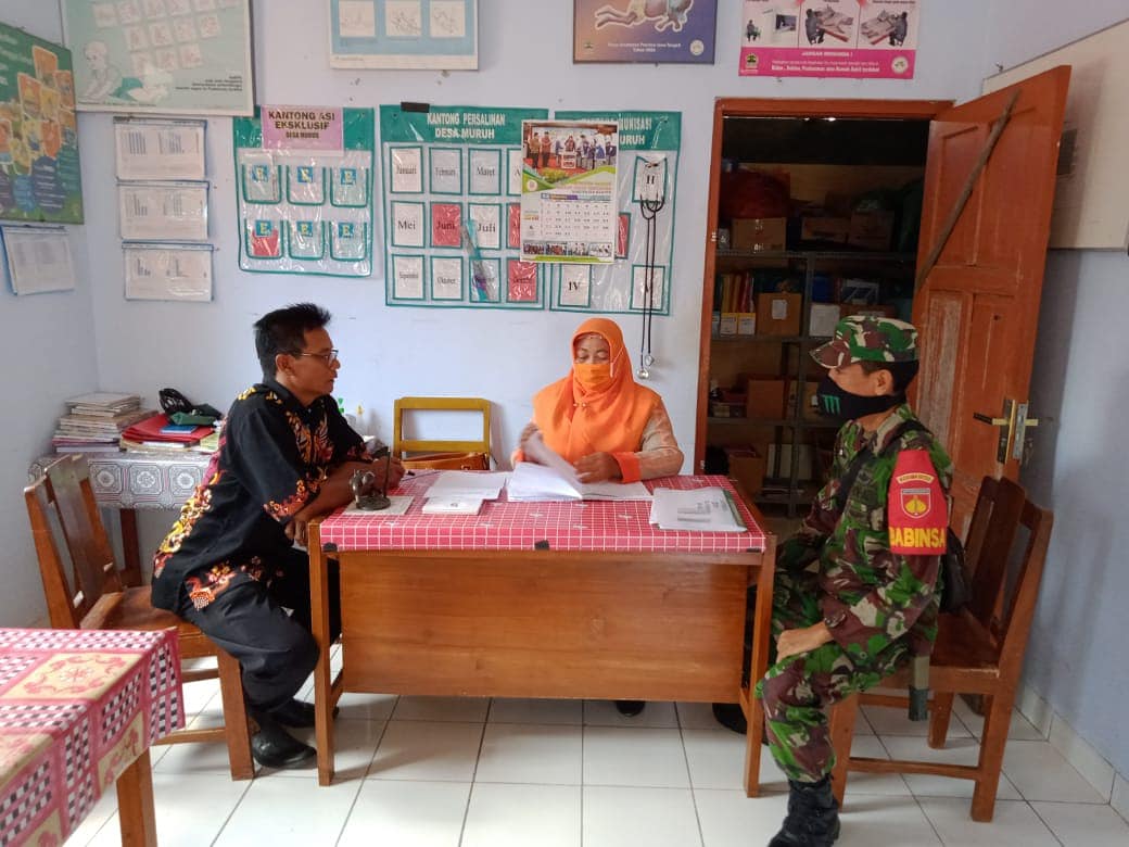 Sertu Tenang Suseno melaksanakan komsos dan koordinasi dengan Pemerintah desa dan bidan desa  Muryanti  di kantor Polindes desa Muruh, Senin (6/4/2020)