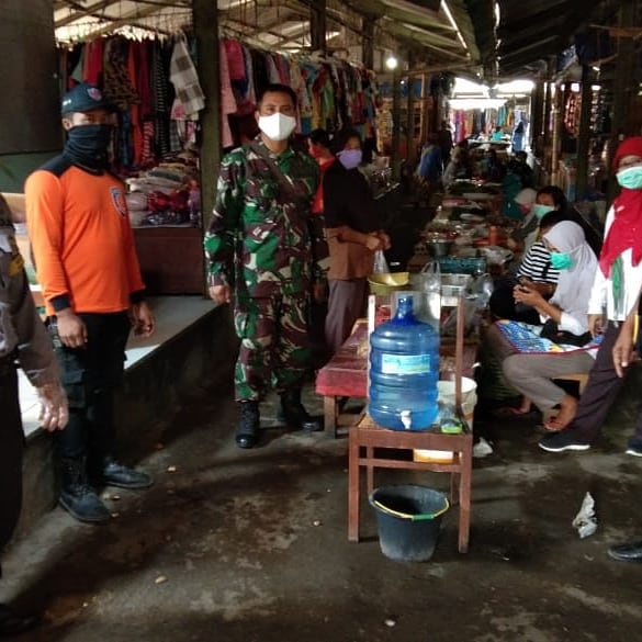 Anggota Babinsa Koramil12/Manisrenggo dan Babinkamtibmas bersama dinas kesehatan, relawan dan Pemerintahan desa patroli sekaligus sosialisasikan penggunaan masker dan social distancing bertempat dipasar tradisional Klewer kec Manisrenggo, Kamis (16/4/2020).