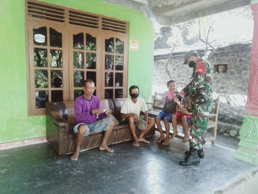 Serda Tekat Joko Susilo babinsa Koramil 02/Jogonalan jajaran Kodim 0723/Klaten, anjangsana sekaligus membagikan masker kepada masyarakat dengan maksud untuk mencegah penyebaran Covid-19. Senin (11/05/2020)