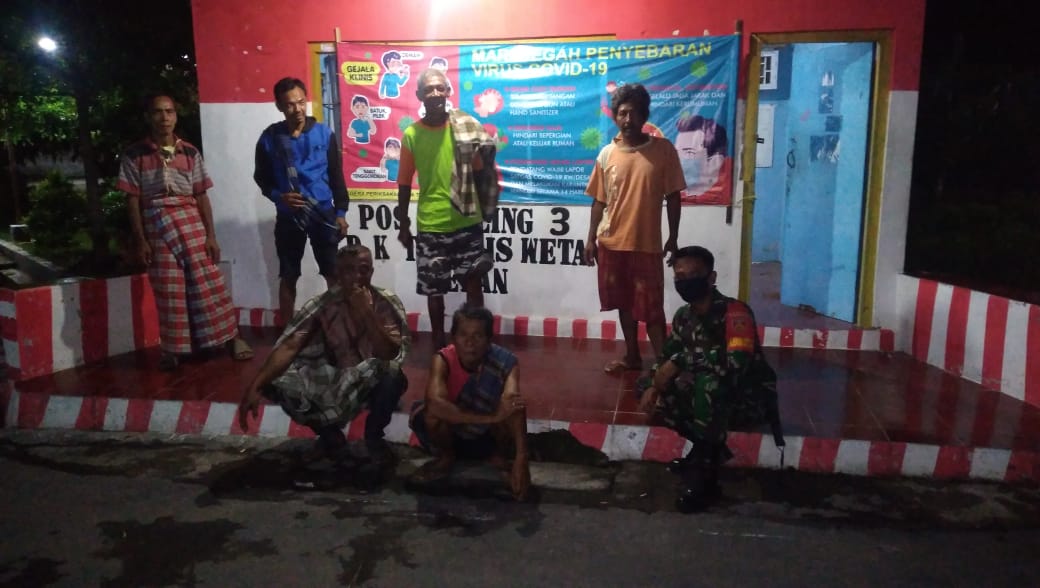 Babinsa Koramil 04/Pedan kodim 0723/Klaten melaksanakan patroli Wilayah dan komunikasi sosial (komsos) dengan warga masyarakat di pos kamling di desa Jetiswetan kecamatan Pedan kabupaten Klaten. Rabu ( 27/05/2020 )
