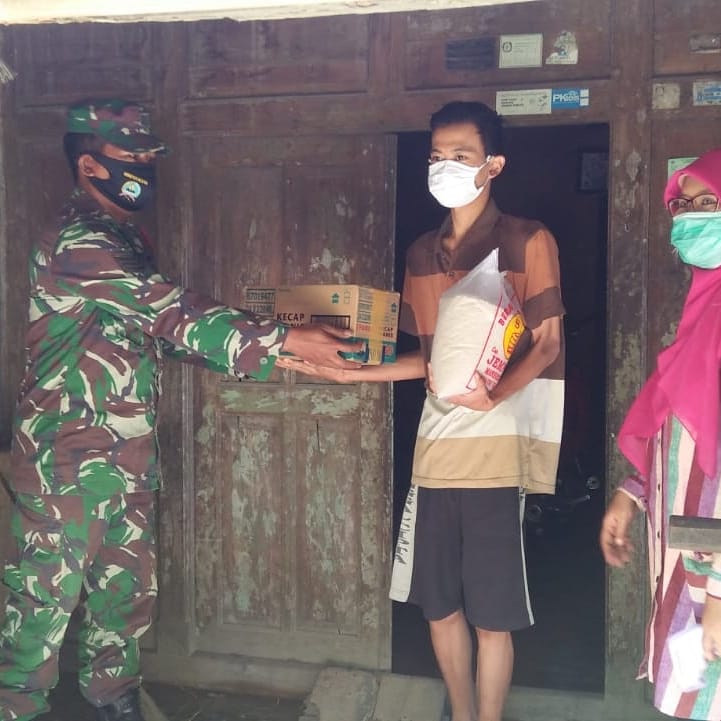 Babinsa Kelurahan Desa Tanjungsari Serka catur Anggota Koramil 12/Manisrenggo Kodim 0723/Klaten memberikan bantuan sembako bersama tim Satgas Covid-19 Puskesmas, relawan,dan perangkat Desa, Minggu (10/05/2020).