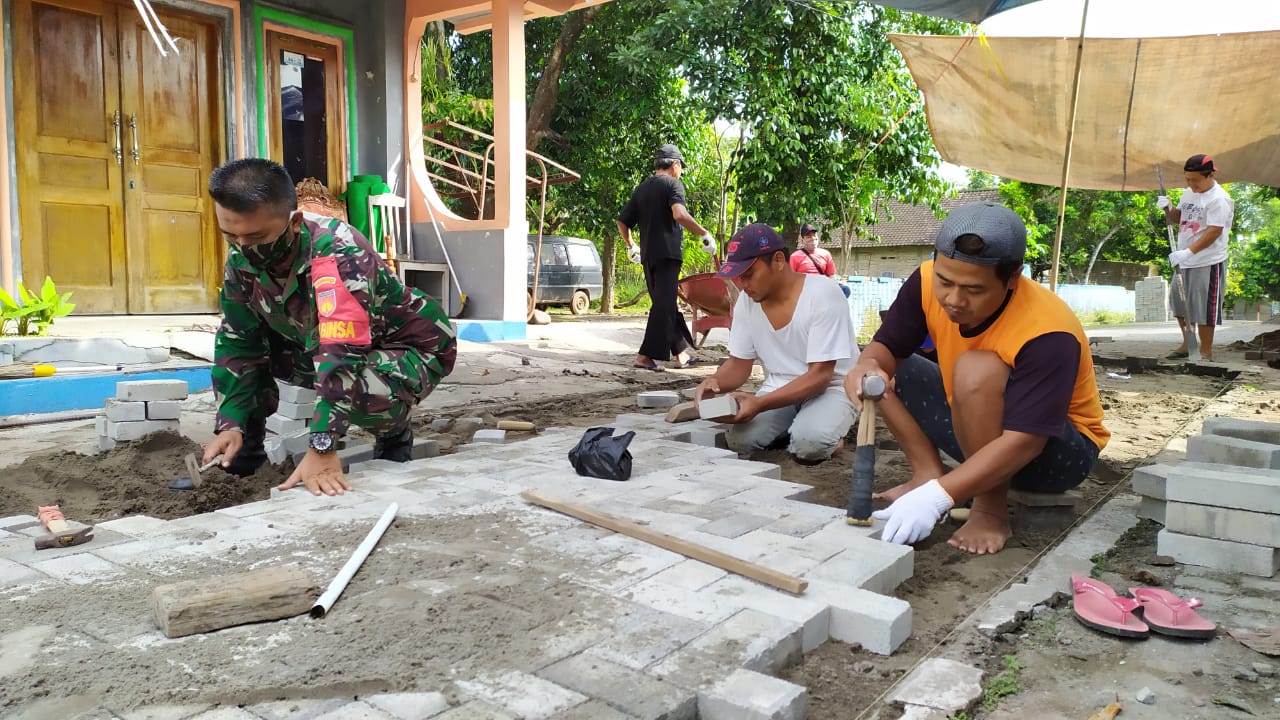 Membantu pemasangn Pavingblok di jalan tengah kampung Dk kahuman Rt 7 Rw III Ds Sidowayah Kec Polanharjo Kab Klaten merupakan salah satu wujud kerja nyata Babinsa Sebagai Aparat Teritorial, Senin (18/05/2020).