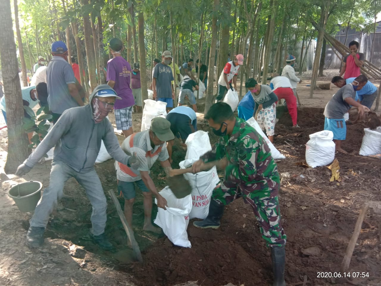 Sertu Wahyoko Babinsa Koramil 04/Pedan Kodim 0723/Klaten bersama masyarakat desa binaannya melaksanakan kegiatan karya Bhakti perbaikan tanggul sungai kaligawe di desa kaligawe , kecamatan Pedan , kabupaten Klaten. Minggu ( 14/06/2020 )