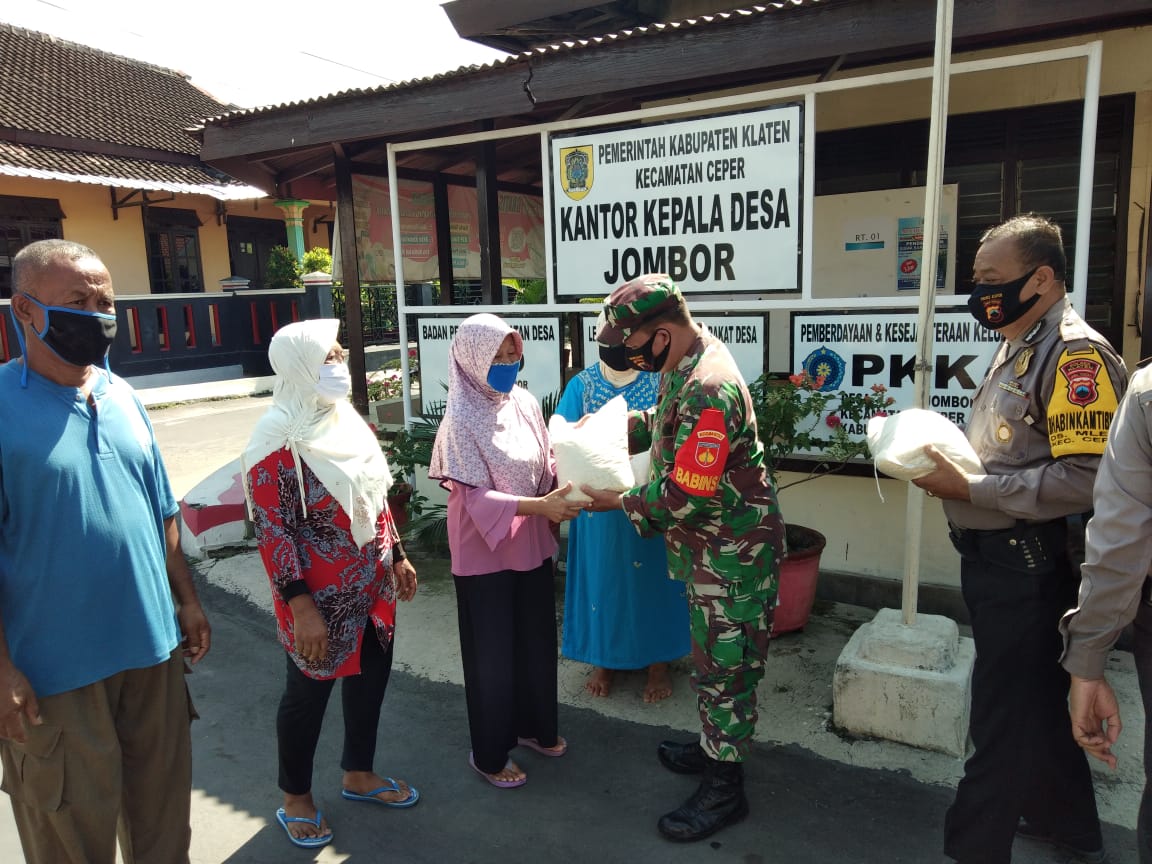 Untuk pembagian sembako dibagikan langsung oleh Babinsa dan Babinkamtibmas wilayah Kelurahan Jombor Kecamatan Ceper Kabupaten Klaten karena merekalah yang mengetahui data warganya sehingga bisa tepat sasaran.
