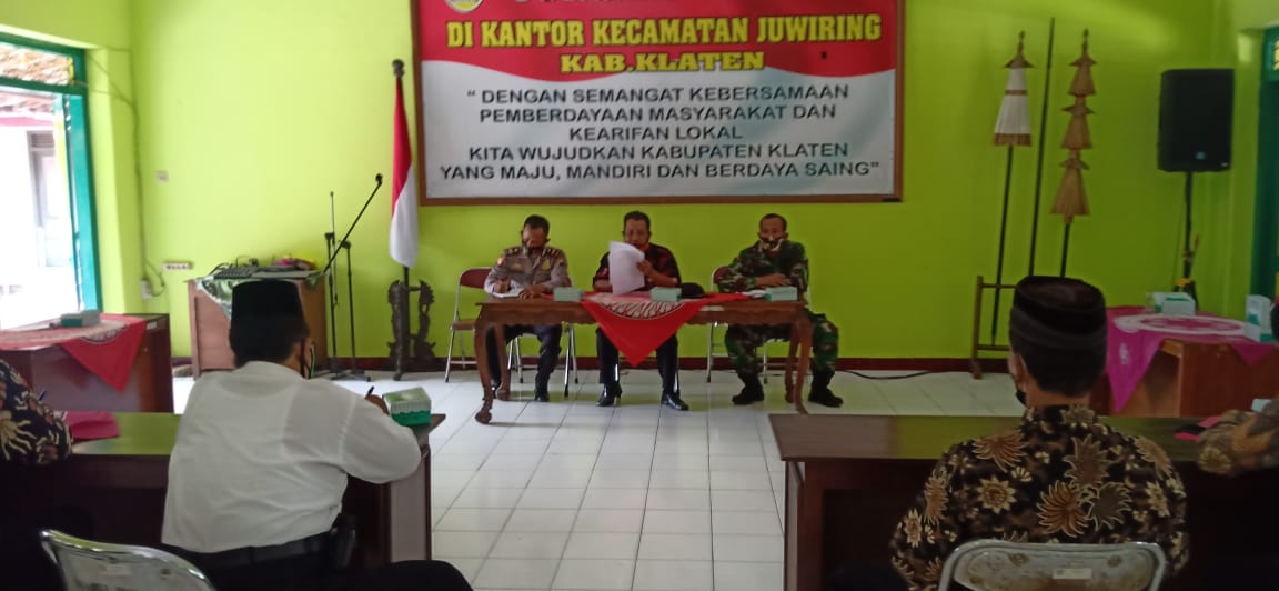 Camat Juwiring Herlambang Jaka Santosa, SH, MM, mengatakan rapat ini dalam rangka membentuk Tim Peninjau Persiapan Tempat Ibadah,  Mensosialisasikan Surat Bupati Klaten tentang ijin penggunaan tempat ibadah serta pembuatan surat keterangan dari Gugus Tugas tingkat Kecamatan Juwiring,  ungkap Camat Juwiring.