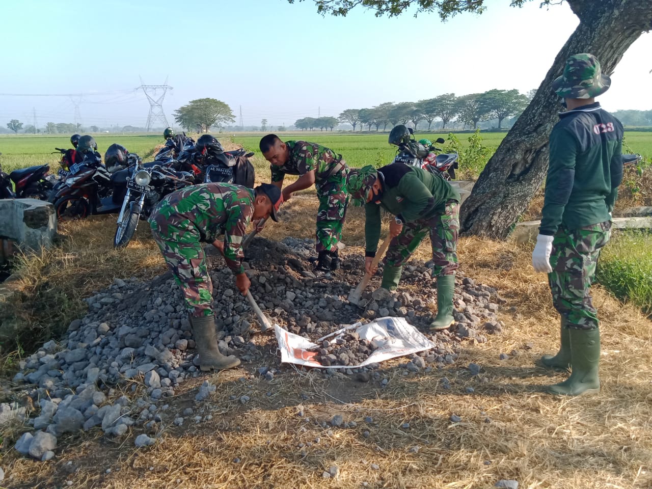 Anggota TNI Kodim 0723/Klaten kerja bakti membersihkan dan meratakan badan jalan di Desa Sawahan, Kecamatan Juwiring, Kabupaten Klaten, Rabu (17/6/20).