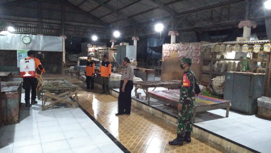 Anggota Koramil 04/Pedan kodim 0723/Klaten Melaksankan kegiatan monitoring Penyemprotan Disinfektan pada malam hari di pasar-pasar wilayah kecamatan Pedan kabupaten Klaten. Senin (29/06/2020)