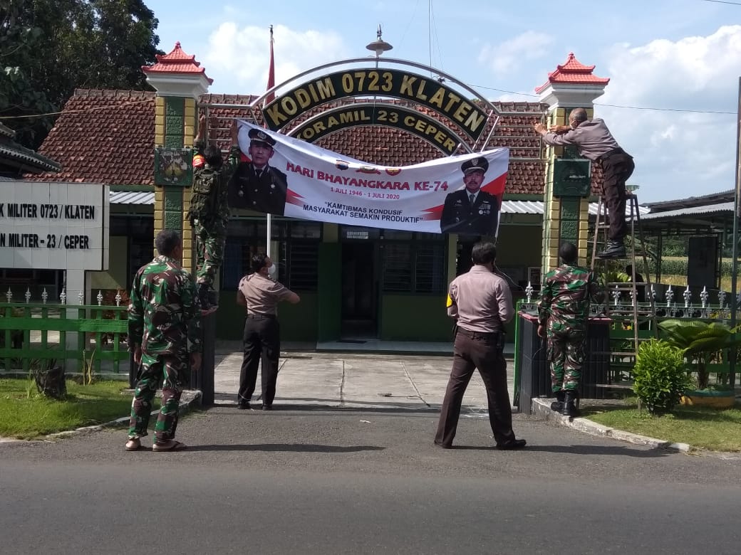 Dalam kegiatan tersebut personel Koramil 23/Ceper bersama-sama memasang spanduk ucapan Selamat Hari Ulang Tahun (HUT) Bhayangkara Polri ke-74 yang dipimpin langsung Danramil Kapten Czi Rusmani. Selasa (23/06/20).