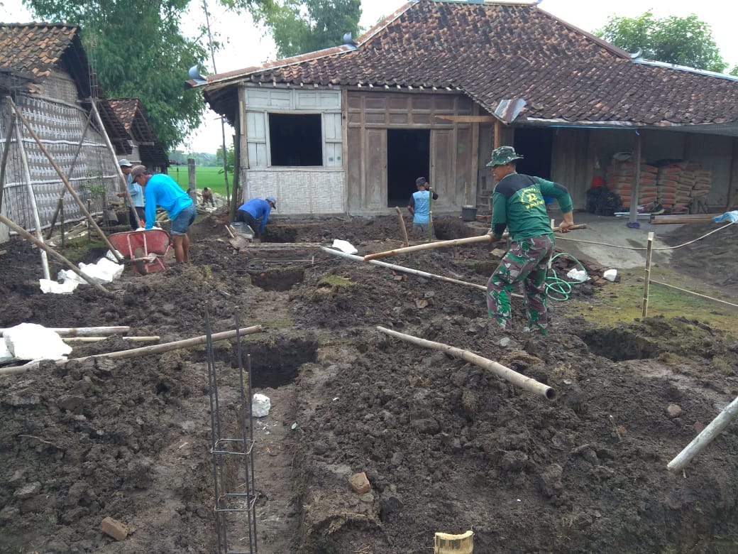 Serda Surojo Babinsa Desa Teloyo Koramil 22 Wonosari Kodim 0723 Klaten bersama dengan masyarakat bergotong royong membangun rumah tidak layak huni (RTLH) milik Karjono (62) Dk.Babadan Desa Teloyo Kecamatan Wonosari kabupaten Klaten.Selasa (14/7/2020)