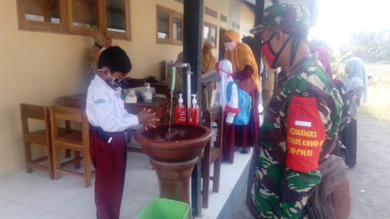 Seperti yang telah dilakukan Sertu Ali anggota Koramil12/Manisrenggo yang ditugaskan sebagai Babinsa Desakranggan, Kecamatan Manisrenggo, Kabupaten Klaten untuk melaksanakan pemantauan dan pengawasan Penerapan Protokol Kesehatan di SD MI dalam menghadapi New Normal serta untuk pencegahan penyebaran virus corona (Covid-19).