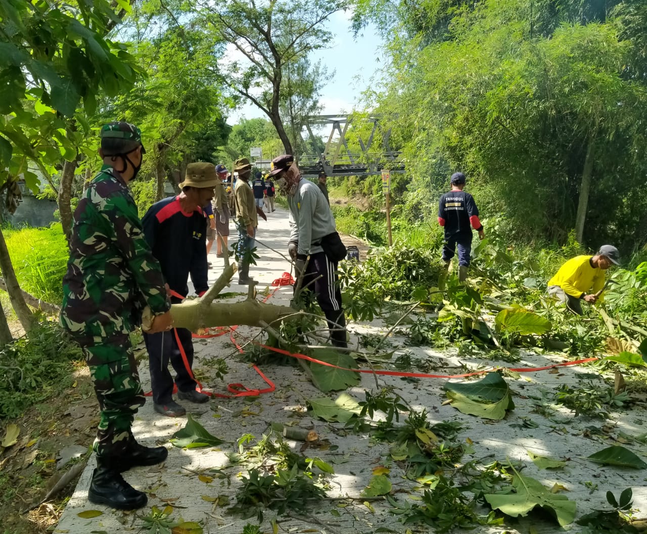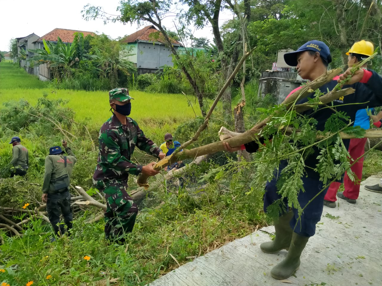 Babinsa Koramil 20 Cawas Kodim 0723/Klaten Pelda Timbul Prawoto bersama Pemdes dan Petugas Balai besar wilayah sungai bengawan Solo ( BBWS) melaksanakan kegiatan kerja bakti membersihkan fasilitas umum jalan dan tepian Sungai Dengkeng menuju obyek wisata Jembatan Pelangi di Desa Balak, Kecamatan Cawas, Kabupaten Klaten, Kamis (2/7/2020).