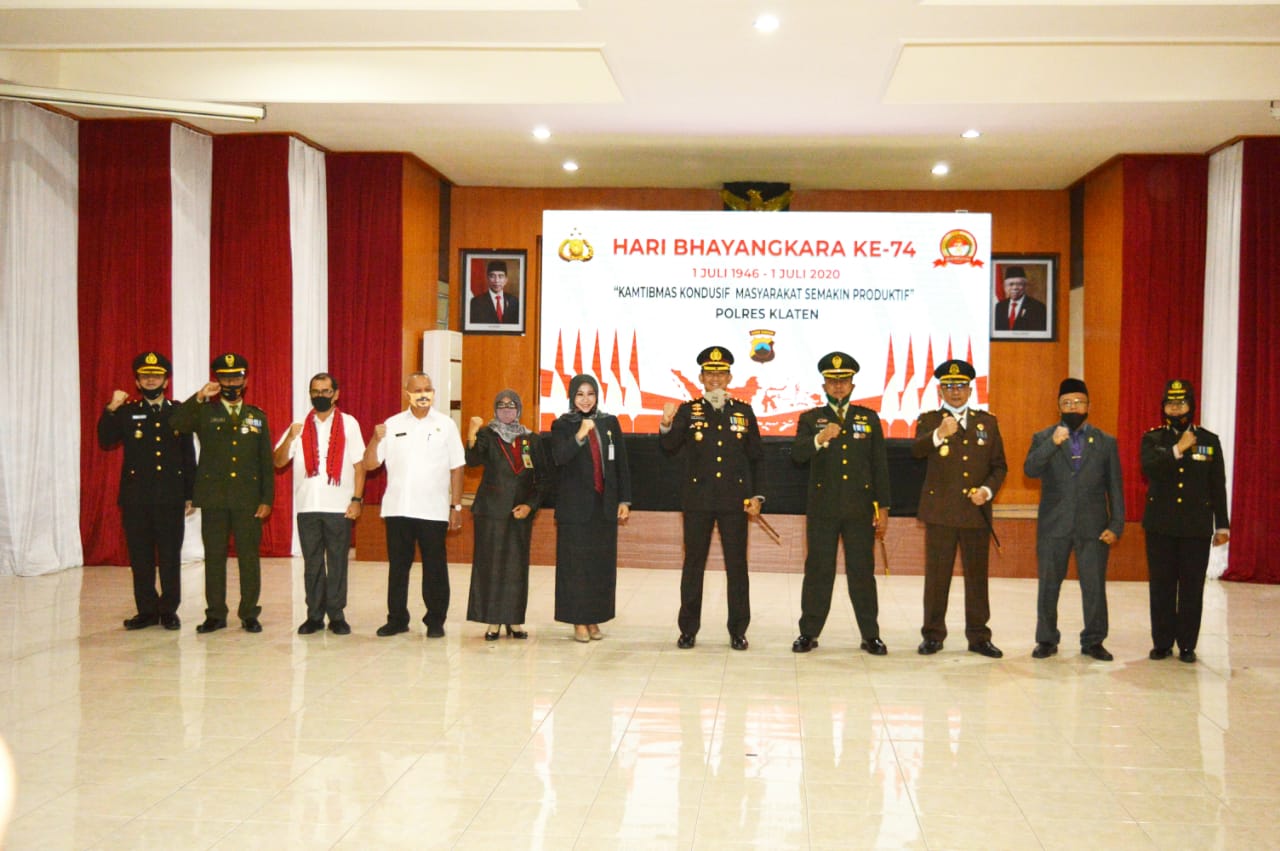 Upacara yang biasanya digelar secara langsung, kini dilakukan secara virtual (online) mengingat pandemi covid-19 belum juga berakhir. Kehadiran personil TNI pada Upacara Peringatan HUT Bhayangkara ke-74 Tahun 2020 merupakan bukti hubungan erat antara TNI-Polri dalam menjaga ketertiban dan keamanan di wilayah Kabupaten Klaten.