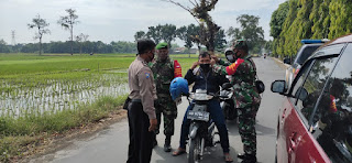 Klaten | Babinsa Koramil 22 Wonosari Kodim 0723 Klaten Sertu Haryanto dan Serda Sri Nuryanto Bersinergi dengan Polsek Wonosari melakukan penenegakan disiplin terpadu Protokoler Kesehatan diwilayah Binaan di Desa Bener Kecamatan Wonosari kabupaten Klaten.Rabu (8/7/2020)