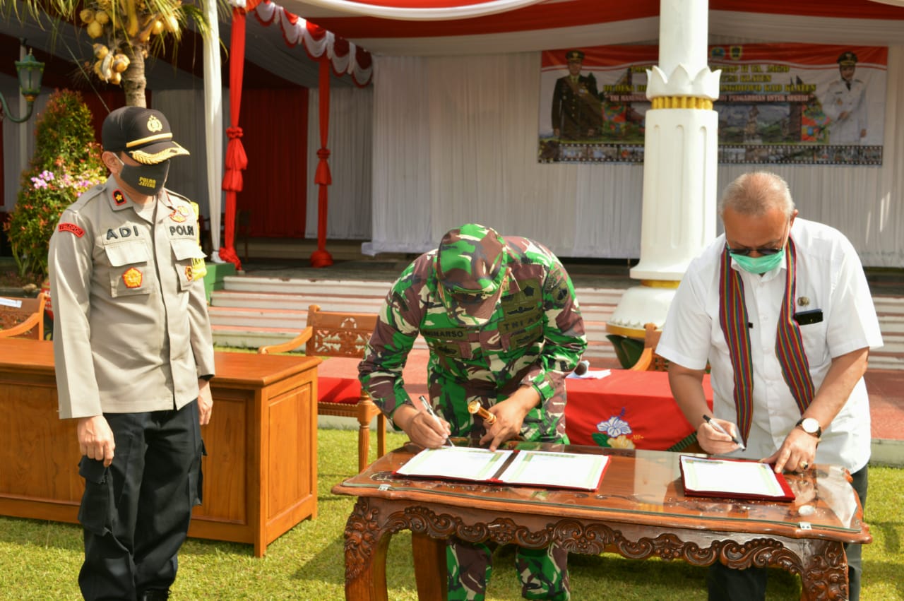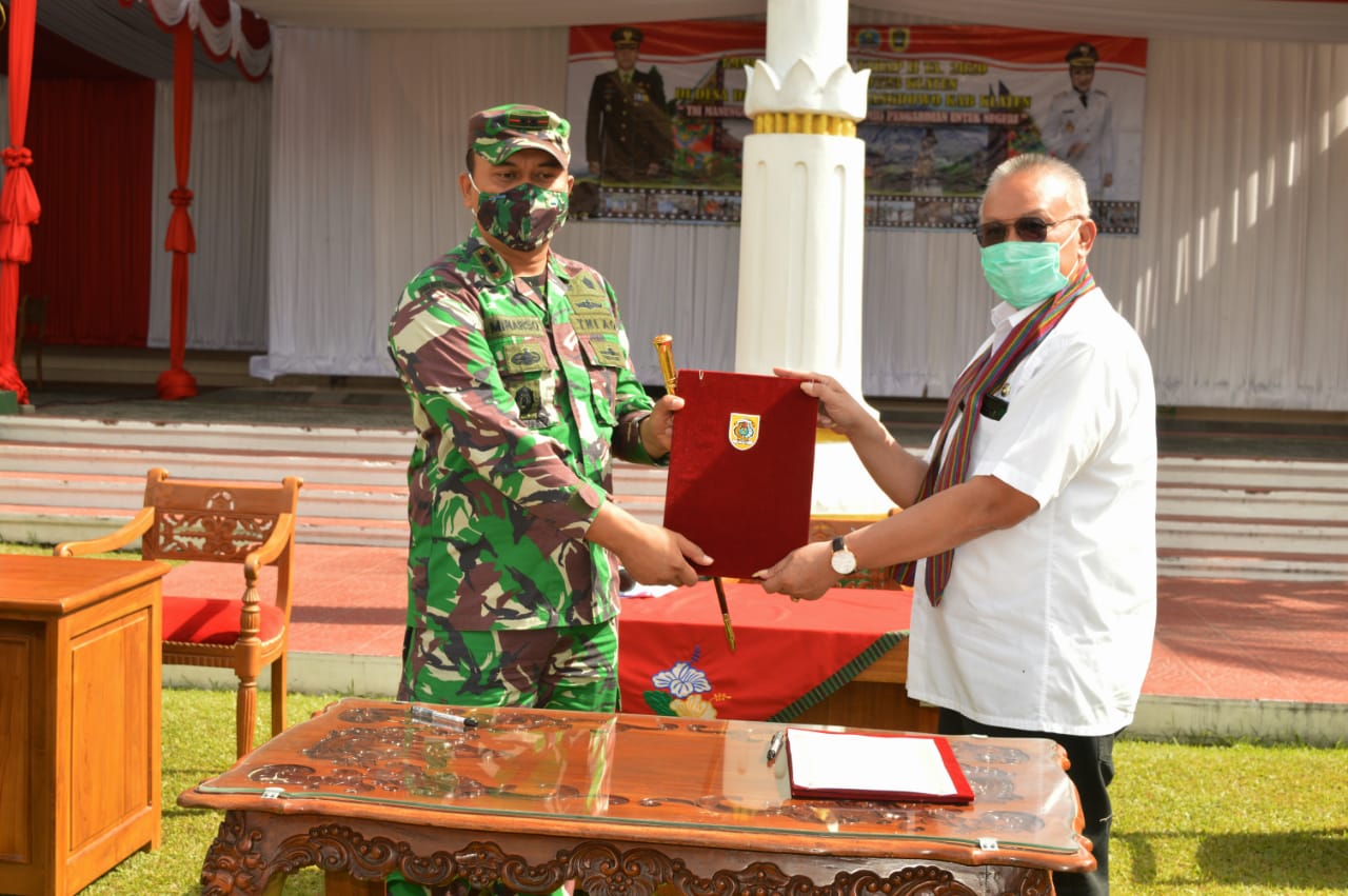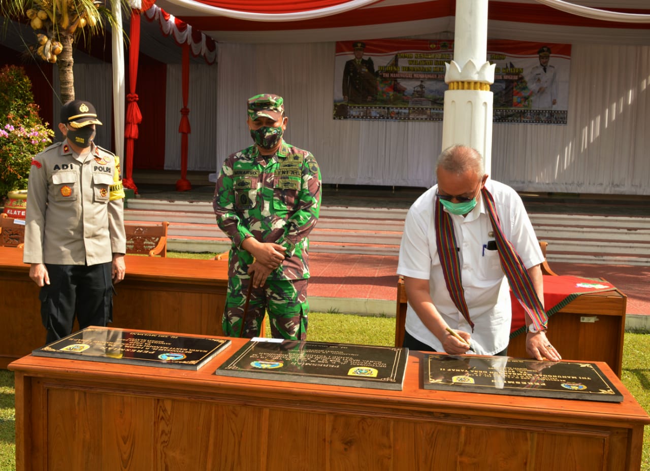 Seusai upacara dilanjutkan serah terima hasil pekerjaan TMMD dari Dandim 0723 Klaten Letkol (Kav) Minarso kepada Bupati Klaten yang diwakili Sekda Kab Klaten