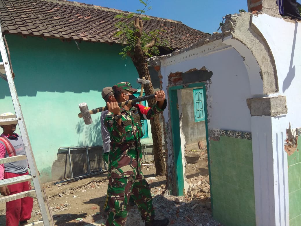 Bintara Pembina Desa (Babinsa) Koramil 20 Cawas Kodim 0723/Klaten Sertu Hari Susanto melaksanakan Gotong Royong Pembongkaran Masjid Al Barokah untuk di rehap total di Dukuh Tegal Kalesan Desa Pogung Kecamatan Cawas Kabupaten Klaten Selasa ( 25/08/2020)