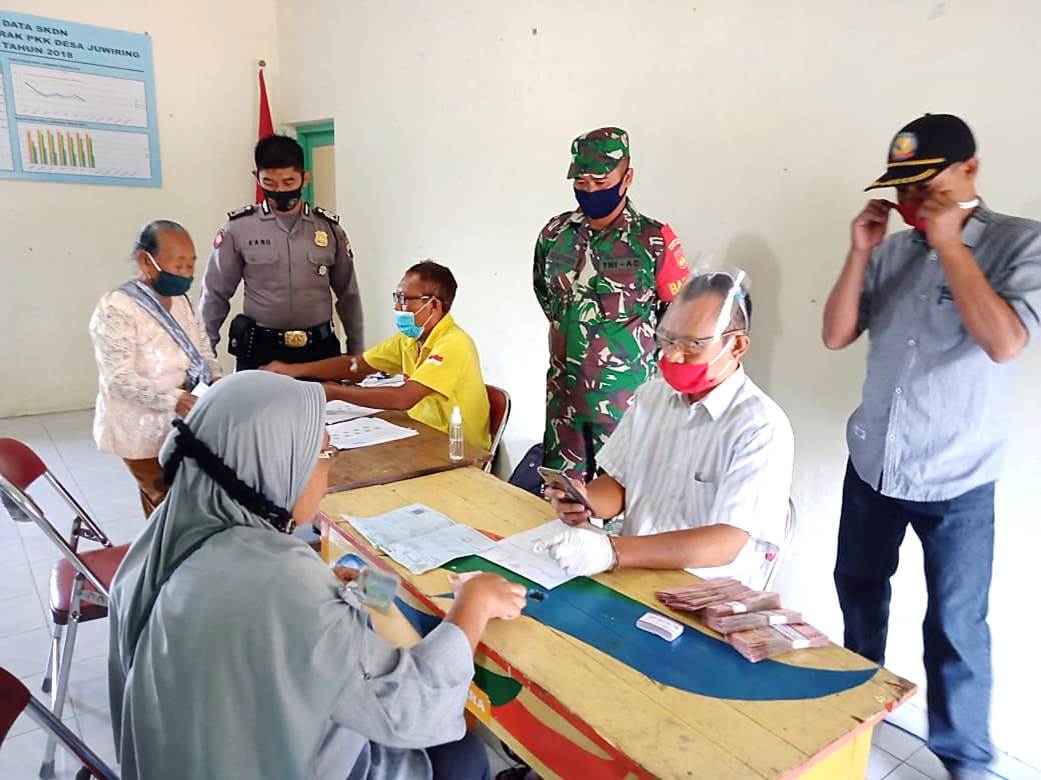 Koramil 21/Juwiring Kodim 0723/Klaten bersama Polsek Juwiring melaksanakan pengamanan kegiatan pembagian BST (Bantuan Sosial Tunai) dari Kementrian Sosial RI yang bertempat di Aula Kantor Desa Juwiring, Kecamatan Juwiring, Kabupaten Klaten, Kamis (27/08/2020 ).