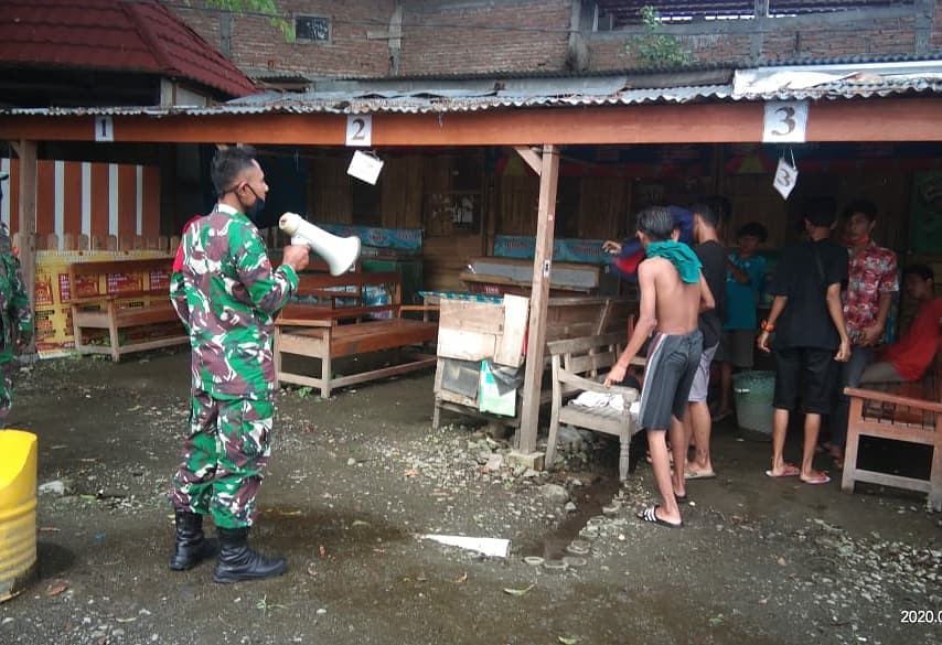 Babinsa Sidowayah Serda Prio Prasetyo bersama Kopda Teguh Anggota Koramil 15/Polanharjo melakukan giat penegakan disiplin protokol kesehatan pencegahan penyebaran wabah virus Corona.Kamis (13/8)