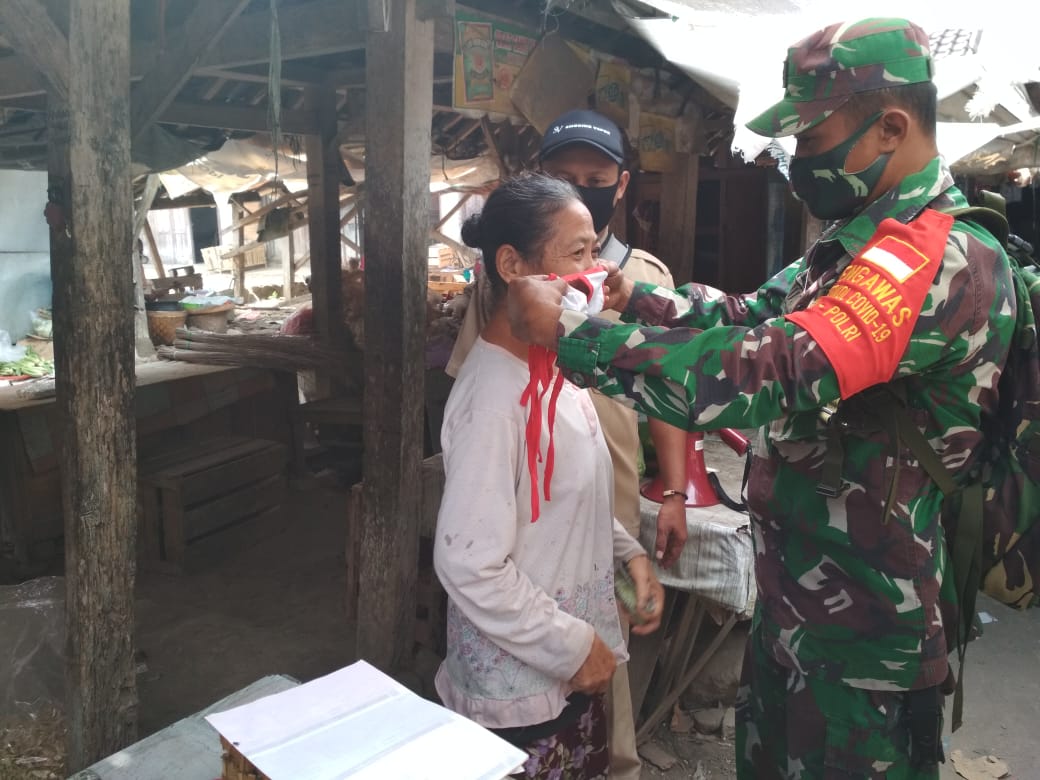 Danramil 16/Tulung Kapten Inf Rudyanto Menambahkan bagi masyarakat yang berkunjung ke pasar tradisional Selogringging dan Pomah yang kedapatan tidak menggunakan masker dari Babinsa diberikan arahan dan dikasih masker supaya dipakai langsung.