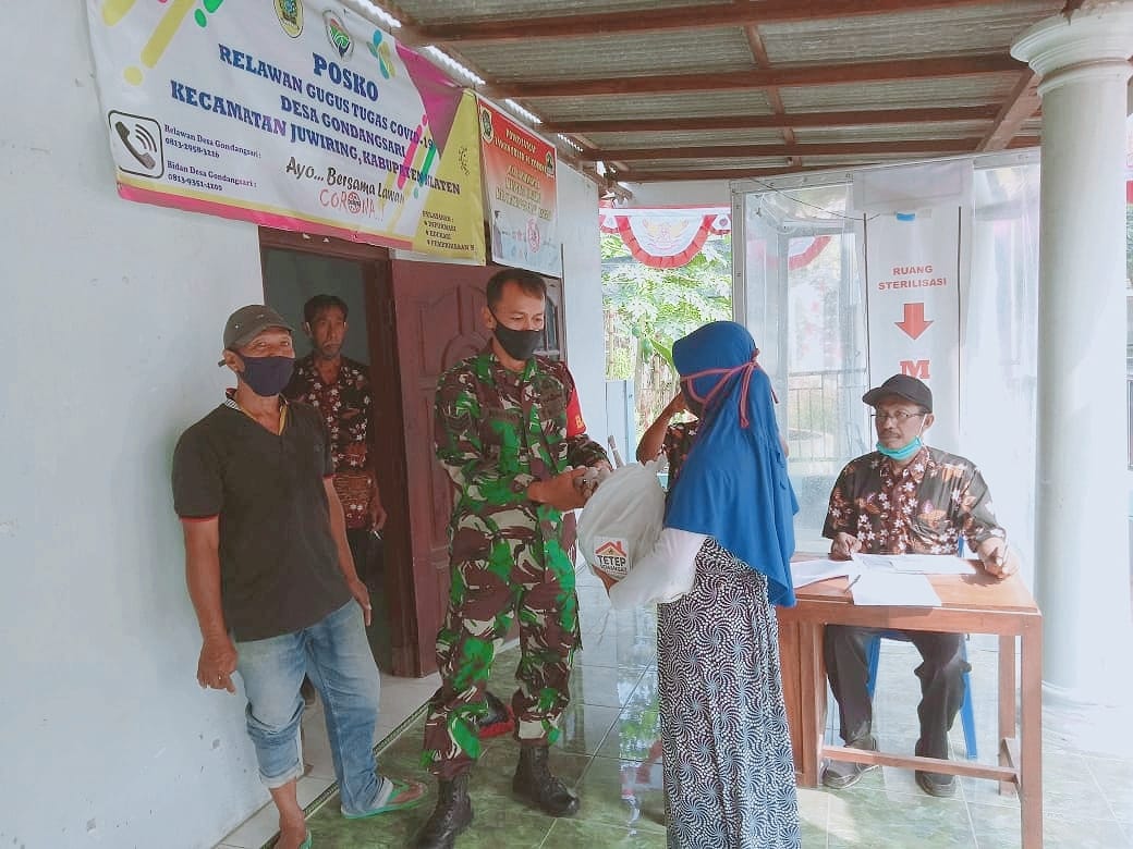 Babinsa Desa Gondangsari Koramil 21/Juwiring Kodim 0723/Klaten Serka Wahyono ikut mendampingi penyaluran Bantuan Sosial dari Pemerintah Provinsi Jateng kepada warga kurang mampu yang terdampak pandemi covid-19, di wilayah Desa Gondangsari, Kecamatan Juwiring, Kab. Klaten, untuk memastikan agar bantuan tersebut tepat sasaran dan sampai kepada yang berhak menerimanya, Selasa (11/08/20).