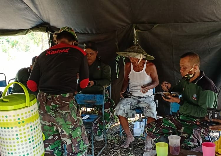 Saat istirahat siang, untuk melepas lelah, tak canggung lagi, Para TNI makan di tenda yang sudaah di sediakan bersama warga Desa Kranggan.